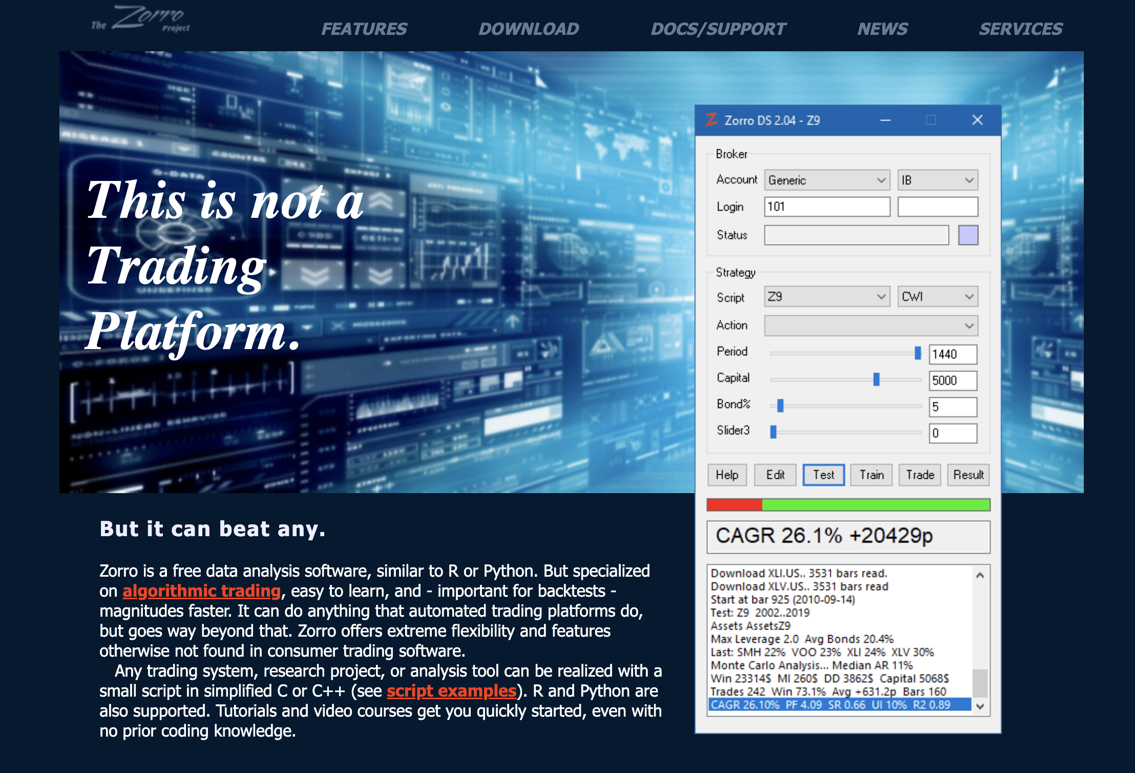 Program your systematic trading strategies in Zorro Trader, using the C and R programming languages.